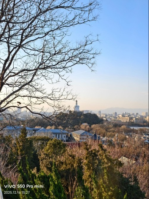 在同一场景,vivoS50Promini用两颗镜头的不同焦段拍摄下来的湖面,无论是天空的色彩还是建筑细节都保持一致,放大到10X后建筑牌匾上的“万春亭”三字清晰可见。
