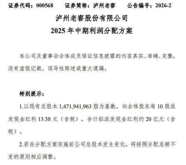 扬子晚报网1月10日讯(记者范晓林薄云峰)泸州老窖(000568)1月9日晚发布2025年中期利润分配方案。
