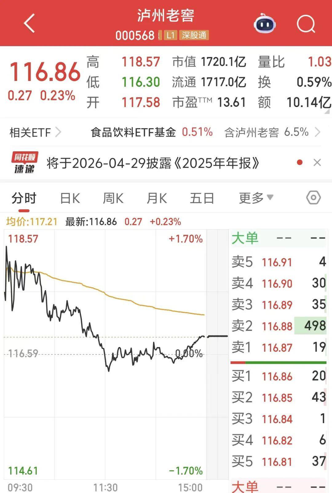 泸州老窖市值1720.1亿元。
